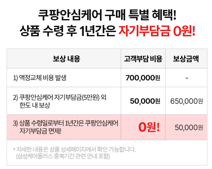 쿠팡안심케어 구매 특별 혜택을 제공하는데 상품 수령 후 1년간은 자기부담금 0원에 이용할 수 있습니다.