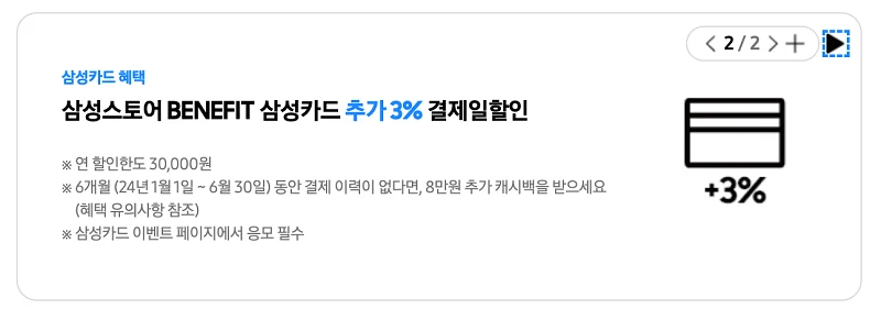여기에 삼성 베네핏 카드가 있다면 추가 3% 를 받을 수 있습니다.