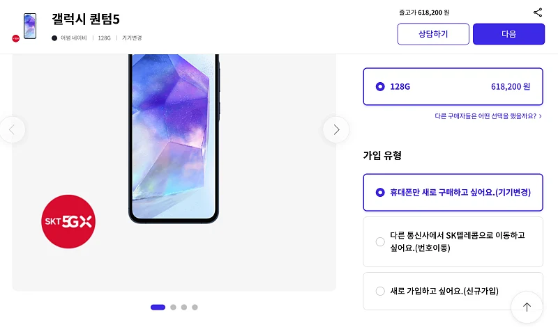 갤럭시 퀀텀5는 SKT 전용 모델이라 티월드(T월드) 홈페이지에서 구매하실 수 있습니다.