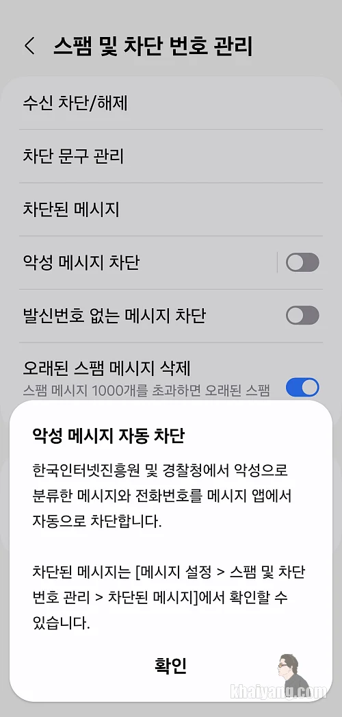 이렇게 설정해 놓으시면 스팸 문자 때문에 받는 스트레스가 좀 줄어드실 수 있습니다.