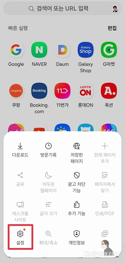 삼성 인터넷 브라우저 메뉴 항목에서 설정을 선택 합니다.