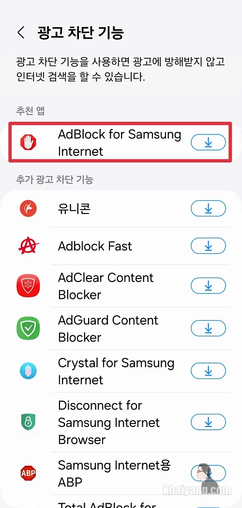 저도 뭔지 모르는 앱들이 많은데 여기에서 상단 추천 앱으로 나와 있는 애드블록(Adblock) 포 삼성 인터넷을 선택하고 설치를 합니다.