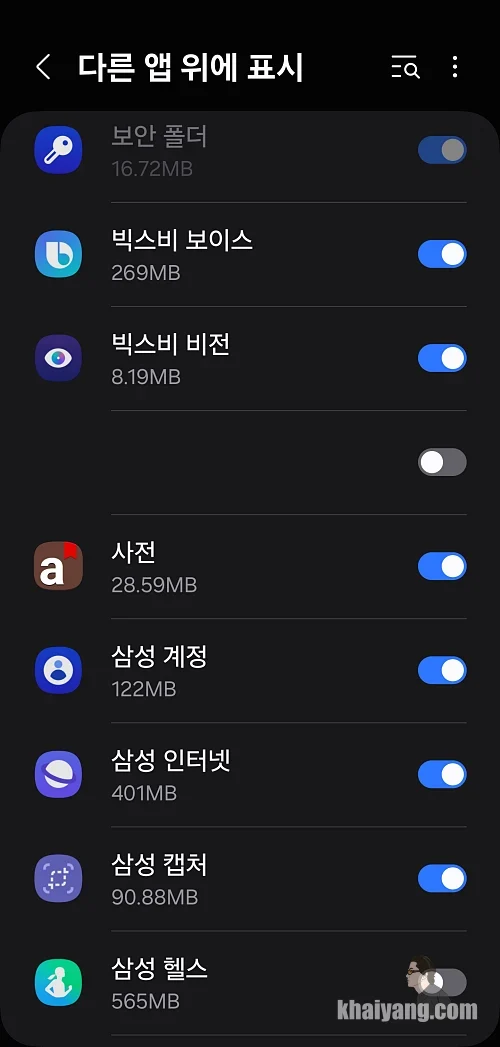 복용 리마인드를 실행 하려면 권한 허용을 해주셔야 합니다. 삼성헬스 부분을 선택하셔서 파란색 부분이 나오게 활성화 시켜 주시면 됩니다.