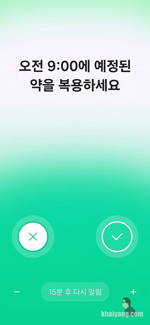 복용 시간이 되면 독특한 알람과 함께 스마트폰 화면에서 표시를 해줘서 약 복용을 잊지 않게 해줍니다.