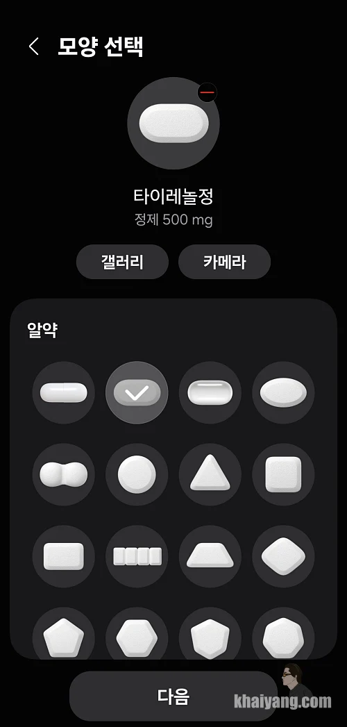 약의 모양과 용량등 다양하게 선택할 수 있고 또는 사진을 촬영해서 직접 모양을 입력할 수 있습니다.