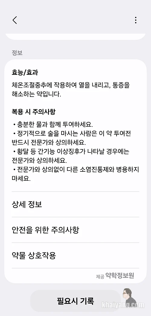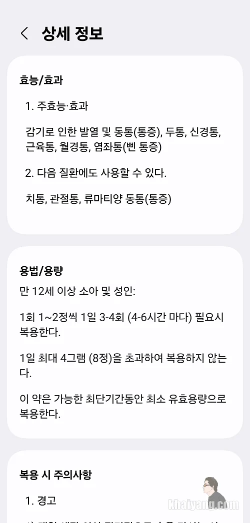 약학정보원 데이터를 바탕으로 만들어지는 정보인데 상당히 디테일하게 잘 설명이 되어 있습니다.