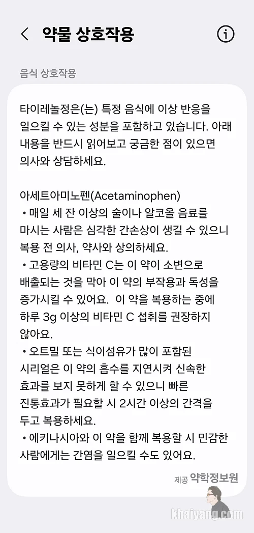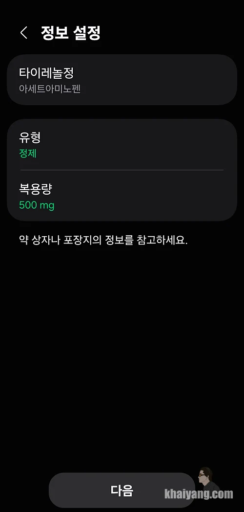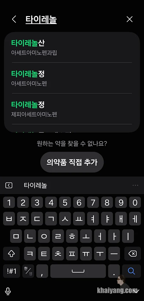 이것 저것 체크해 보니 거의 모든 약이 다 검색이 되는 것 같았습니다. 해열제로 유명한 타이레놀을 한번 검색해서 적용해 봤습니다.