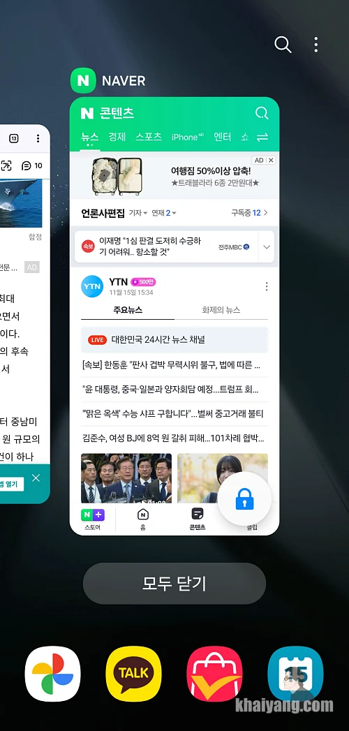 그러면 이렇게 하단에 자물쇠 표시가 되 있는 걸 볼 수 있습니다. 이렇게 되면 자물쇠 표시가 되어 있는 앱은 하단에 있는 모두 닫기를 선택해도 닫히지 않고 남아 있습니다.