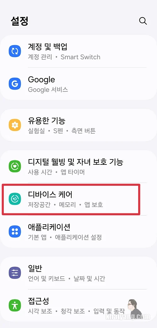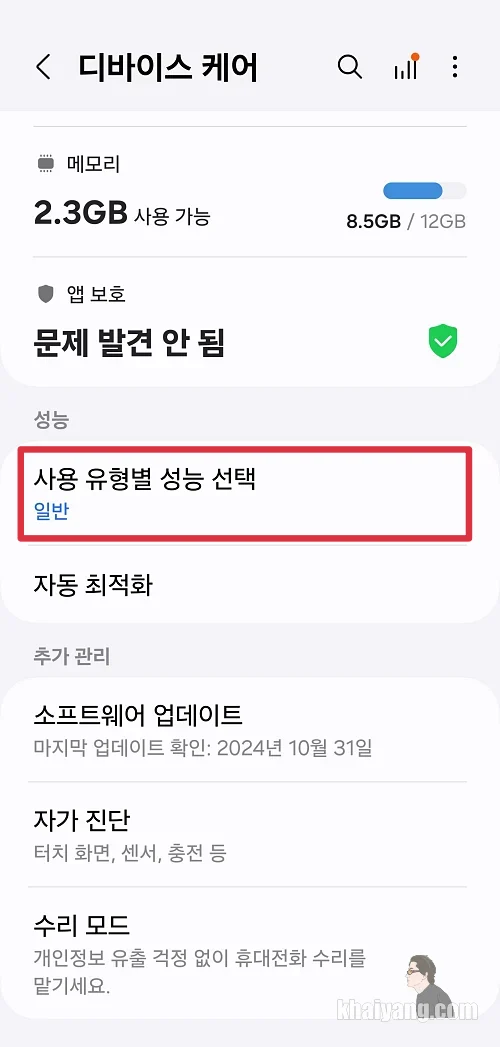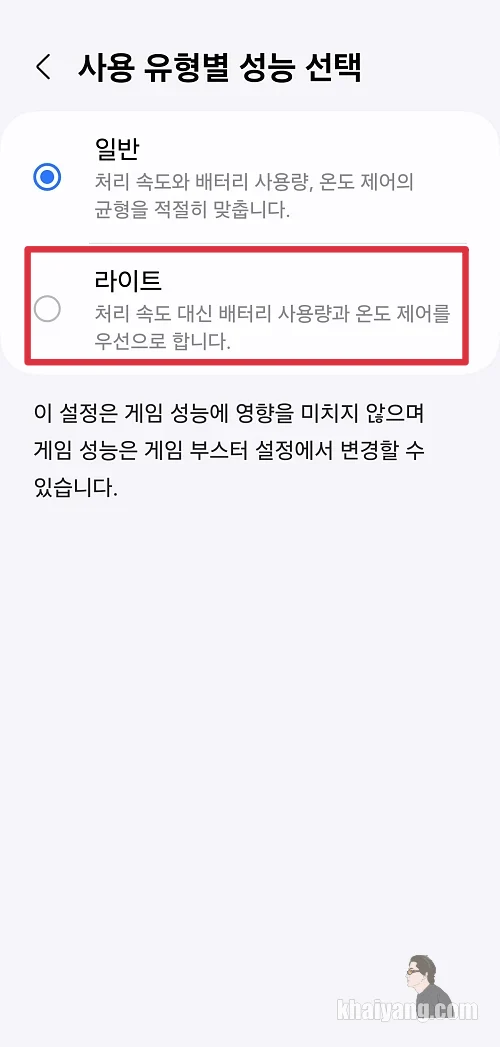 일단 이 설정을 적용하는 방법은 설정 - 디바이스케어 - 사용 유형별 성능 선택 - 라이트 선택 입니다.