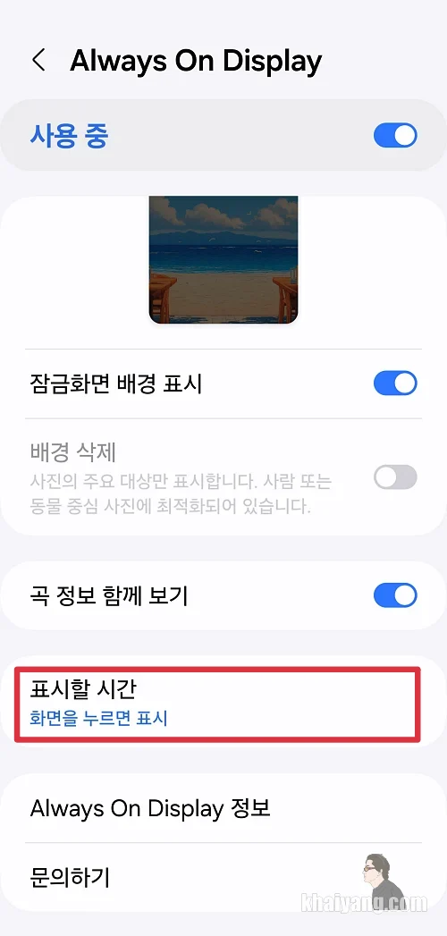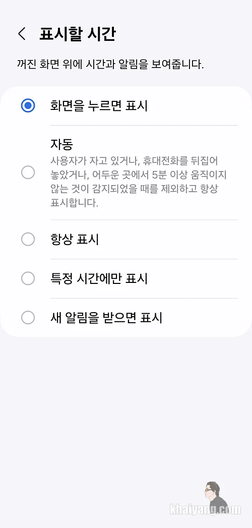 배터리 오래사용하는 것이 가장 중요하다면 AOD 사용하지 않음으로 하는 것이고, 그 다음은 터치할때만 표시하는 순으로 설정을 하시면 될 것 같습니다.