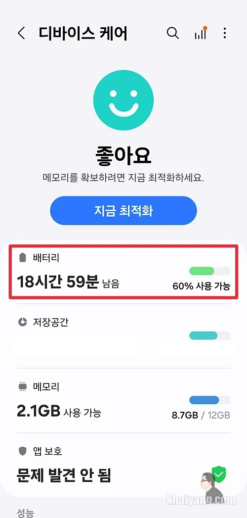 배터리 효율성이 가장 좋은건 최적화 모드라 할 수 있습니다.