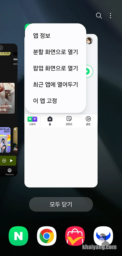 그러면 이렇게 하단에 자물쇠 표시가 되 있는 걸 볼 수 있습니다. 이렇게 되면 자물쇠 표시가 되어 있는 앱은 하단에 있는 모두 닫기를 선택해도 닫히지 않고 남아 있습니다.