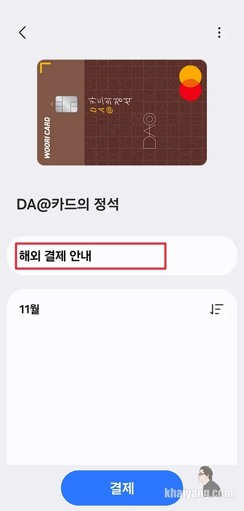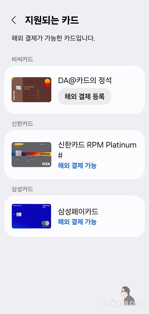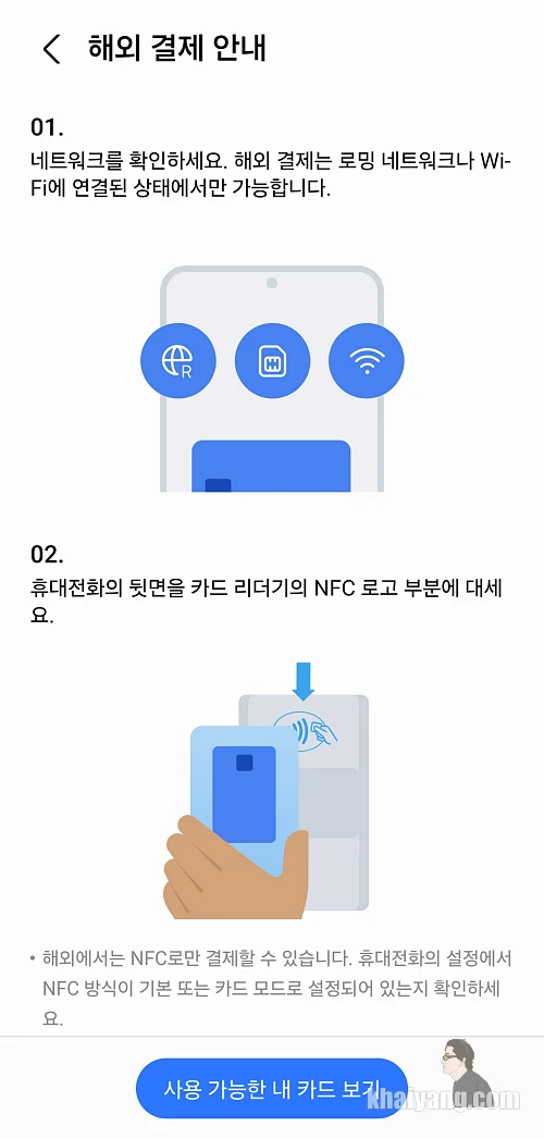 삼성월렛에서 사용하는 카드를 열어보고 이렇게 해외 결제 안내 항목이 있다면 그 카드는 해외 사용이 가능한 카드 입니다.