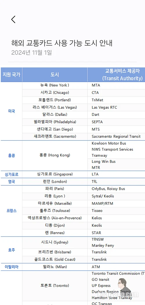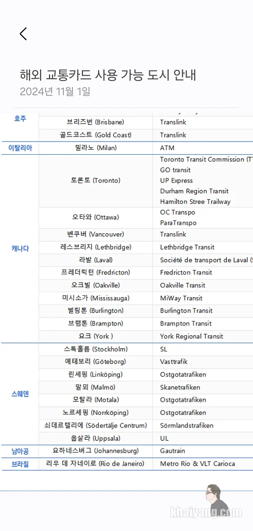 2024년 11월 기준이니 앞으로 업데이트가 되면서 좀 더 많은 나라 도시에서도 교통카드 사용이 가능해질 것 같습니다.