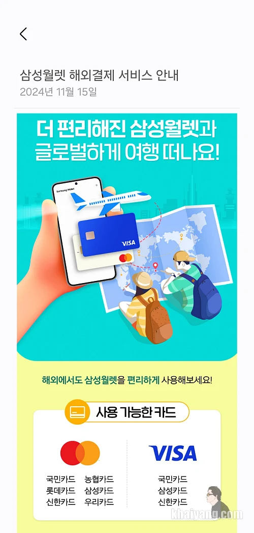삼성월렛 해외 지원되는 카드가 나날이 늘어나고 있습니다. 처음에는 지원 카드도 적고 마스터카드만 가능했는데 이제는 비자 카드 사용자도 해외에서 이용이 가능해 졌습니다.