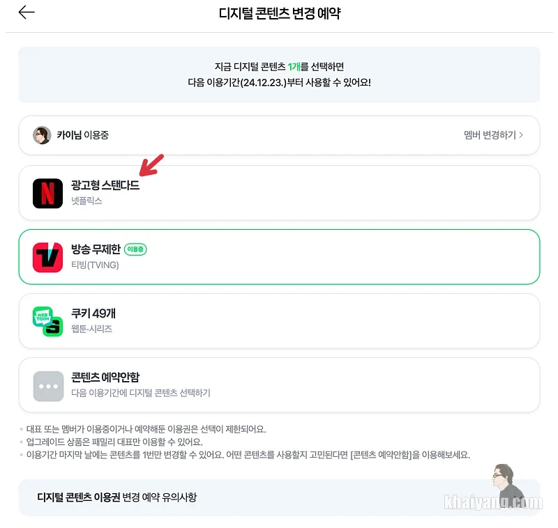 만약 바꾸기를 원한다면 여기서 넷플릭스를 선택하면 됩니다. 선택하면 바로 이용할 수 있는게 아니고 한달 후 부터 사용이 가능합니다.