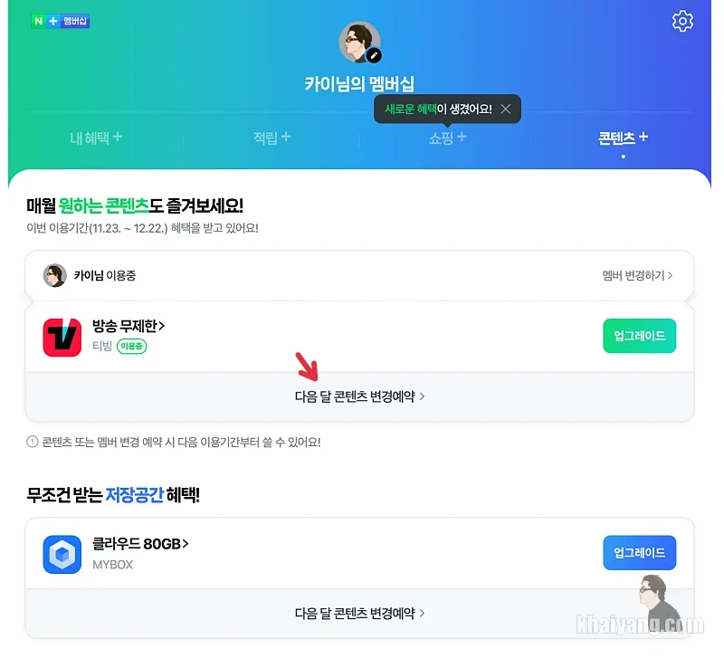 네이버 멤버십 로고가 보이는 곳을 클릭하면 나오는 화면에서 상단 콘텐츠 항목을 누르고 다음 달 콘텐츠 변경예약 항목을 선택하면 됩니다.