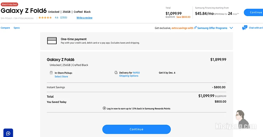 미국 삼성닷컴 공식웹사이트에서는 지금 Z폴드6 256GB 자급제 모델을 1,099.99달러에 판매되고 있습니다.