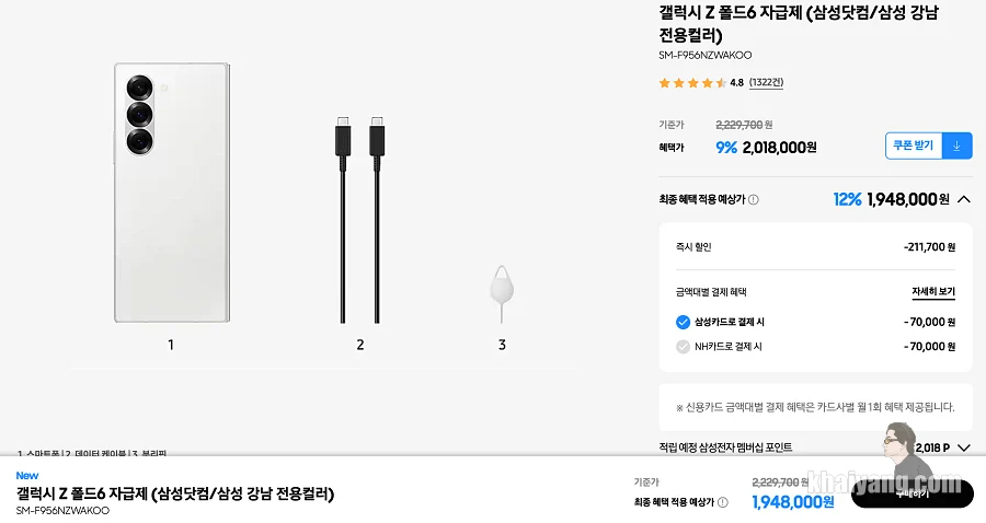 삼성카드, NH카드 신용카드 할인까지 받는경우 1,948,000원에 폴드6 256GB 자급제 모델을 구매할 수 있습니다.