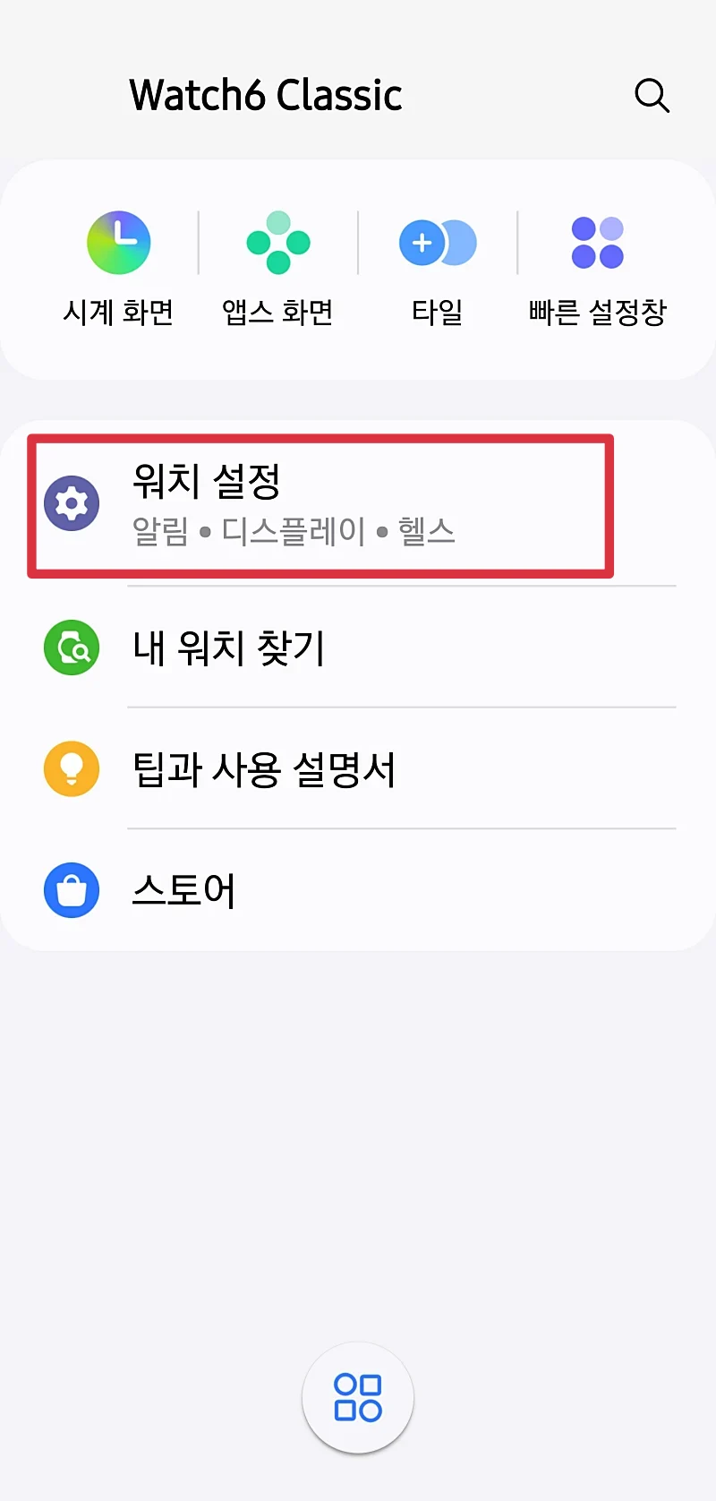 갤럭시 워치 매니저 앱을 실행 시킨 후에 워치 설정으로 들어 갑니다.