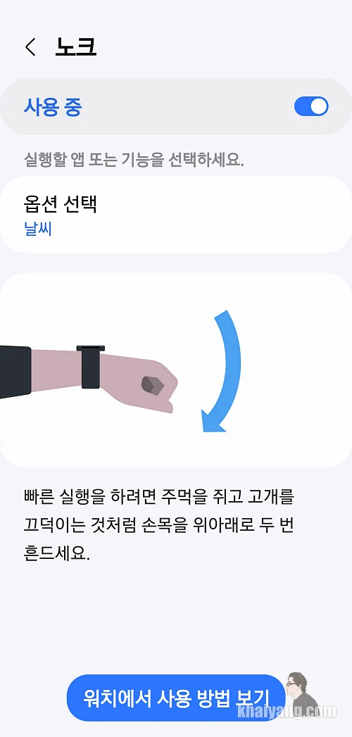 말 그대로 손목을 두번 돌리면 되는데 하단 워치에서 사용 방법 보기를 클릭 하시면 워치에서 작동되는 방식을 친절하게 알려주고 직접 작동하는 모습을 볼 수 있습니다.