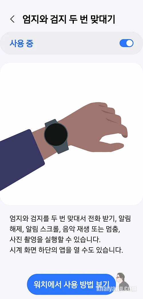사용하기로 바꿔 놓으시면 워치를 찬 손목의 손가락 두개를 맞대는 것으로 전화 받기, 알림 해제, 알림 스크롤, 음악 재생 또는 멈춤, 사진 촬영을 실행할 수 있습니다.