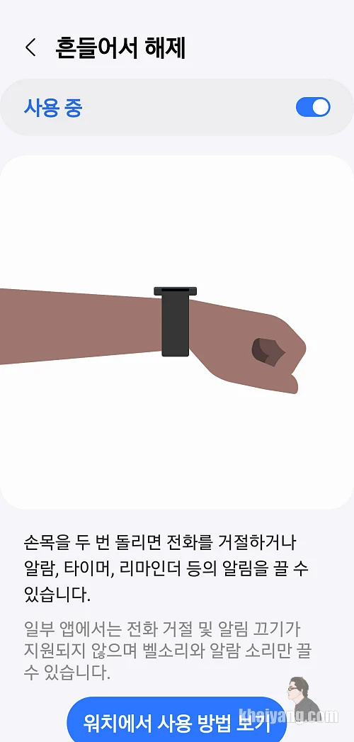 손목을 두 번 돌리면 전화를 거절하거나 알람, 타이머, 리마인더 등의 알림을 끌 수 있습니다. 저는 알림, 타이머가 울릴때 이 동작으로 편하게 이용합니다.