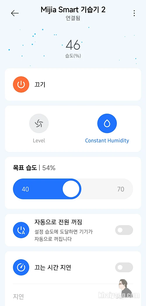 목표 습도를 설정하면 그 수치까지 맞춰주고 설정 습도에 도달하면 자동으로 기기를 끄게 할 수도 있습니다.
