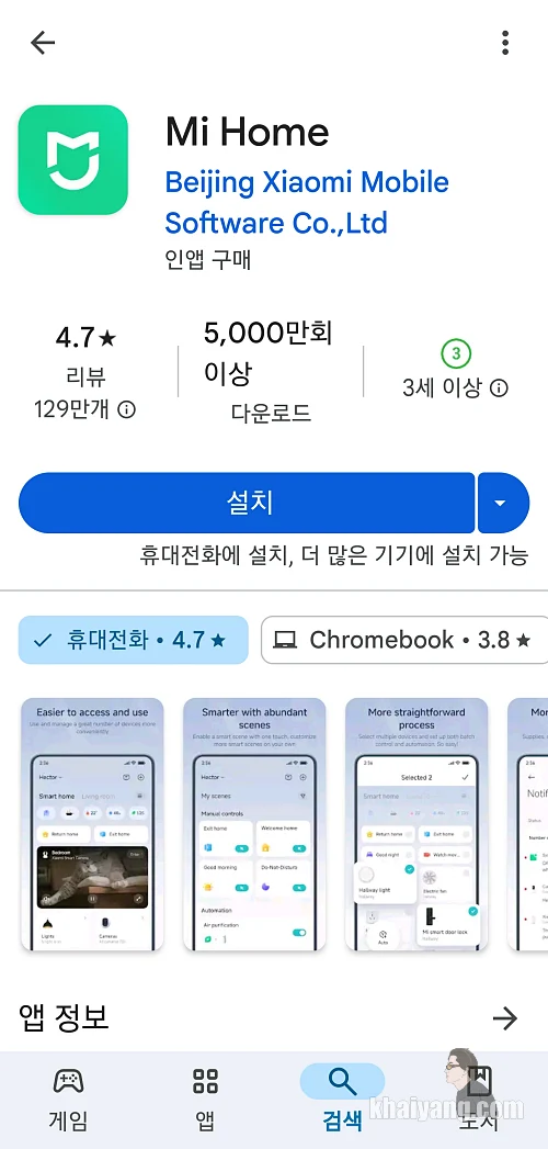 구글 플레이 스토어에서 샤오미를 검색하면 나오는 Mi Home 앱을 다운 받고 설치 합니다. (사진에 나오는 똑같은 앱을 다운 받으세요)