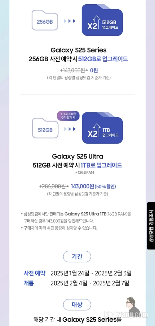 사전구매 기간에 구매를 하게 되면 갤S25 일반 256GB 모델 구매시에 자동으로 용량이 2배 늘어난 512GB 모델을 구매할 수 있습니다.