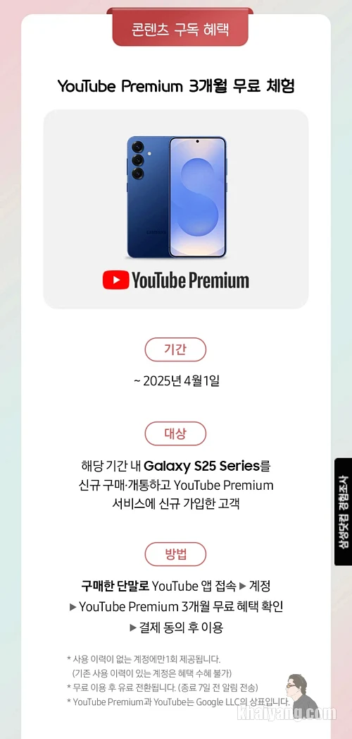 유튜브 혜택이 지난번 갤럭시S24 시리즈때는 없었던 것 같은데 이번에 다시 돌아온 것 같습니다. 요즘 유튜브 구독료가 인플레이션 영향으로 상당히 비싸지고 있기에 유용한 혜택이라 할 수 있습니다.