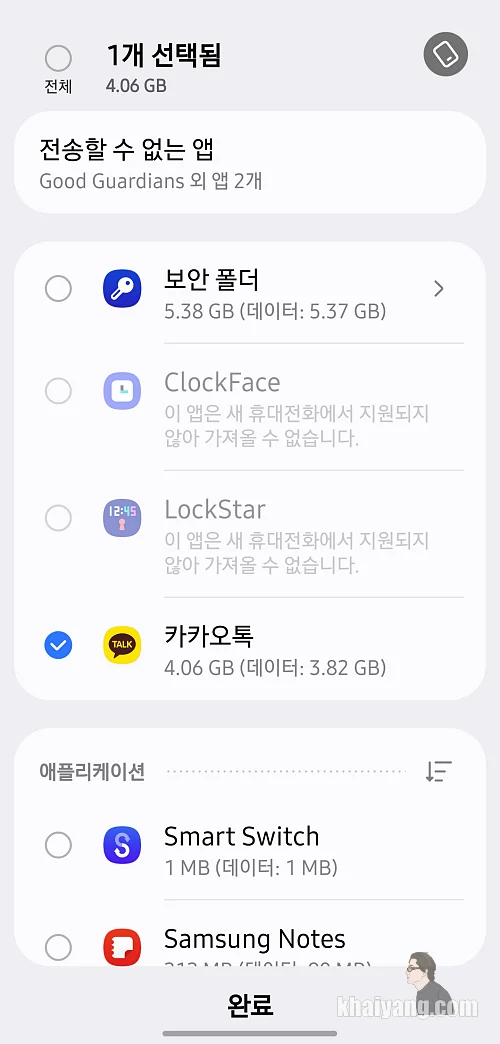 만약 제품을 받고 기존 디바이스에 정보를 모두 옮길 생각이라면 제일 상단에 있는 항목 전체를 선택하시면 됩니다. 하지만 리뷰를 위해서 저는 앱에 들어가서 카카오톡 데이터만 선택을 하겠습니다.