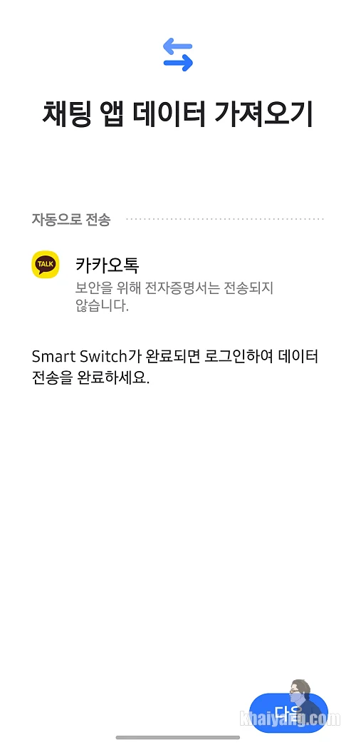채팅 앱 데이터 가져오기 화면을 볼 수 있습니다. 데이터는 다 옮겨지는데 보안을 위해 전자증명서는 전송되지 않습니다.