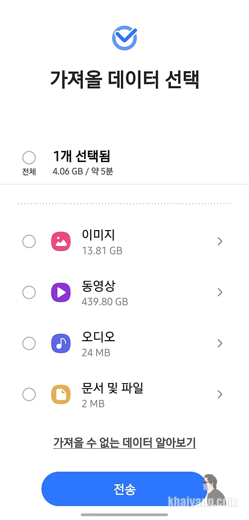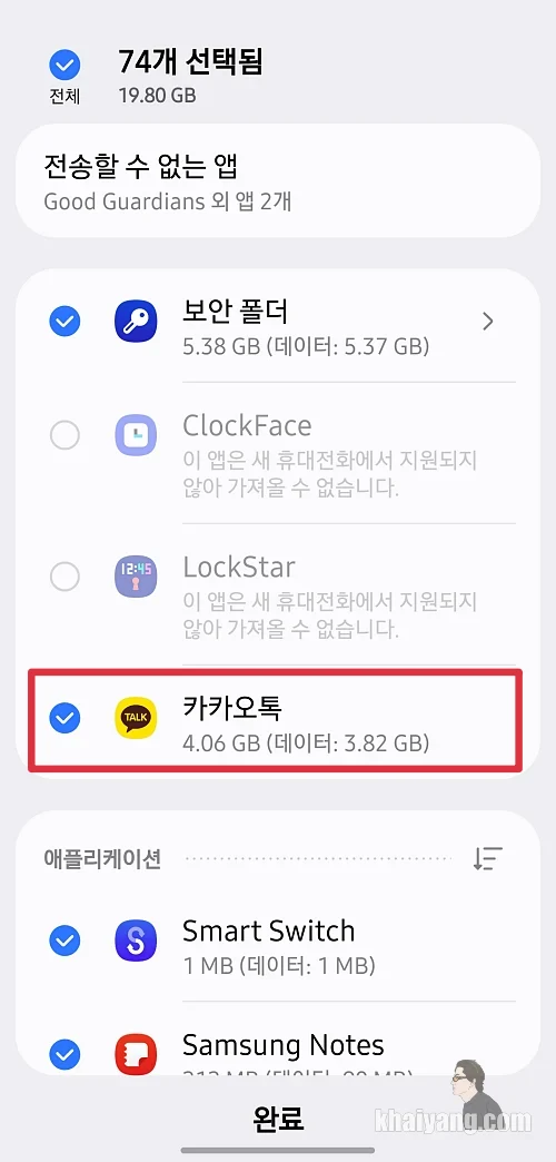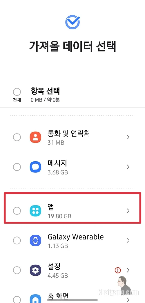 만약 제품을 받고 기존 디바이스에 정보를 모두 옮길 생각이라면 제일 상단에 있는 항목 전체를 선택하시면 됩니다. 하지만 리뷰를 위해서 저는 앱에 들어가서 카카오톡 데이터만 선택을 하겠습니다.