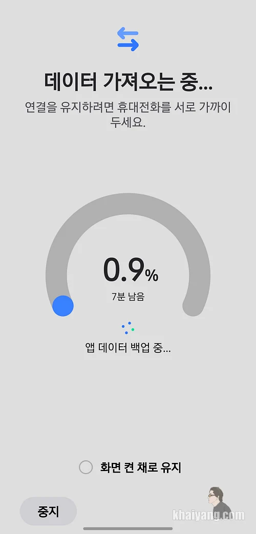 기존에 사용하던 기기에서 스마트 스위치 앱을 실행 하고 나서 팝업창에 뜨는 명령대로 하시면 위에 나오는 화면을 볼 수 있습니다. 예전에 사용하는 기기가 데이터를 보내고 갤럭시S25 에서는 데이터를 받는 겁니다.