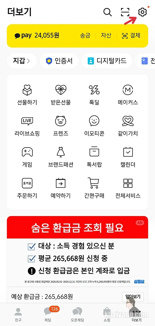 카카오톡을 여시고 상단 오른쪽에 있는 톱니바퀴 모양의 설정을 선택 합니다.