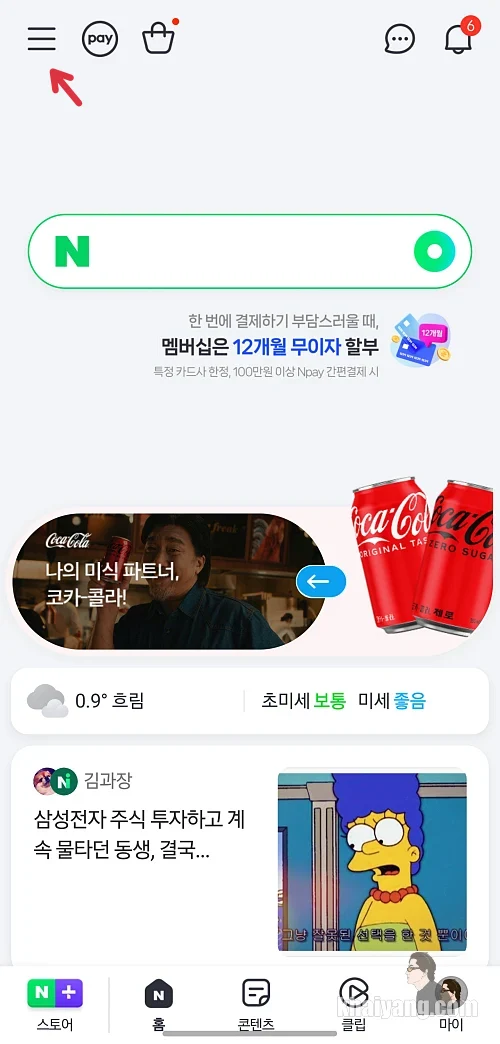 네이버 앱을 열고 왼쪽 상단에 있는 작대기 3개를 선택 합니다.