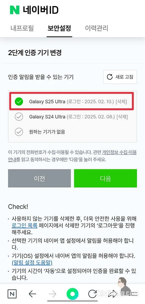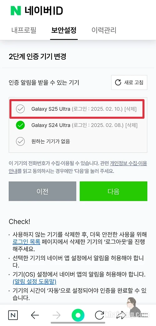 저는 갤럭시S24 울트라 사용하다가 넘어왔습니다. 2단계 인증 기기로 등록이 된 것은 갤S24 울트라로 되어 있기 때문에 새로운 갤럭시S25 울트라로 변경을 해야 합니다.