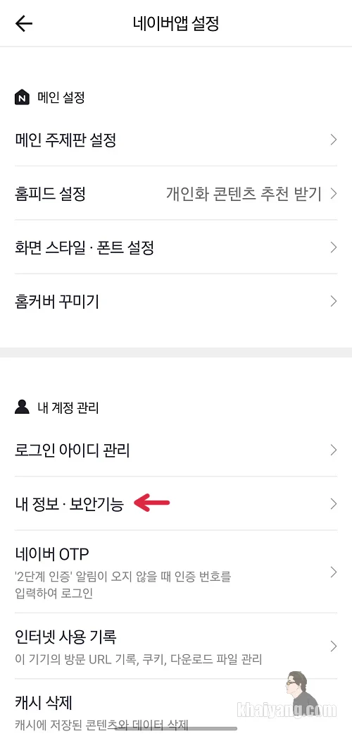 네이버 앱 설정에 들어가서 내 정보/ 보안기능 항목을 선택합니다.
