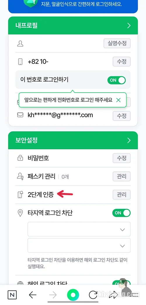 보안설정 항목에서 2단계 인증을 선택 합니다.