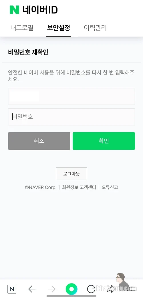 보안을 위해서 네이버 비밀번호를 입력합니다.