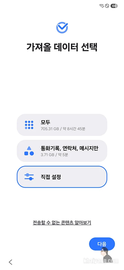 여기서 이제 기존에 있는 스마트폰에서 어떤 자료를 가져올지 선택할 수 있습니다. 만약 모든 자료를 가지고 온다고 한다면 모두를 선택 하시면 되고 간단하게 통화 기록, 연락처, 메시지만 선택할 수 있습니다.