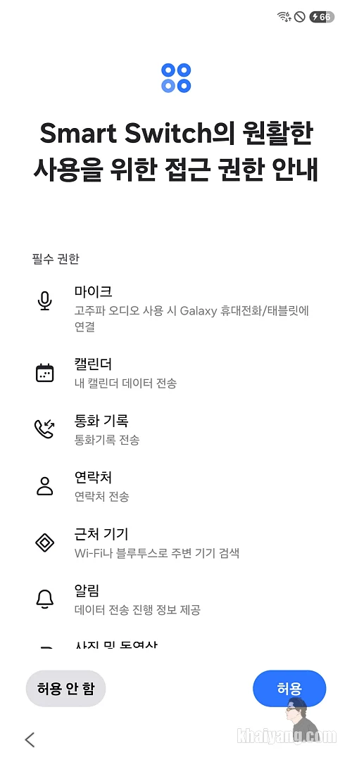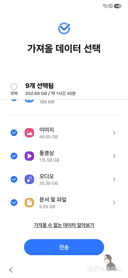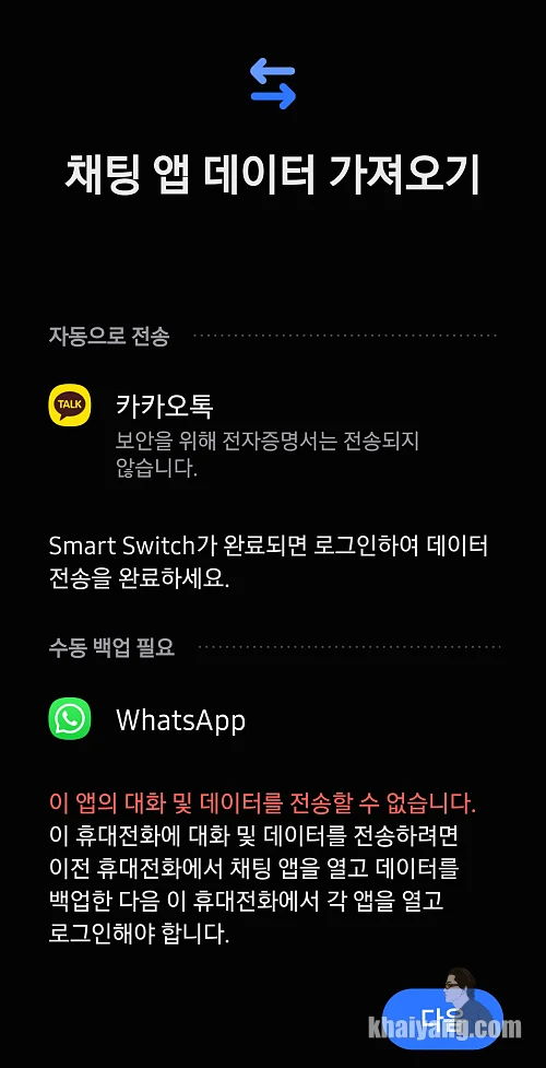 만약 카톡을 계속 사용해야 하는 상황이라면 스마트 스위치로 옮길때는 제외하는 것이 좋습니다. 아니면 늦은 저녁 시간에 카톡 사용을 하지 않아도 될때 이용 하시기 바랍니다.