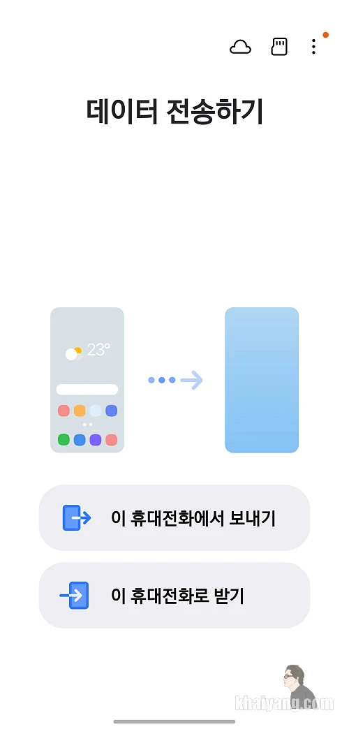 기존 휴대폰에서는 이 휴대전화에서 보내기를 누릅니다. 데이터를 새로운 휴대폰으로 보내는 것이기 때문입니다.