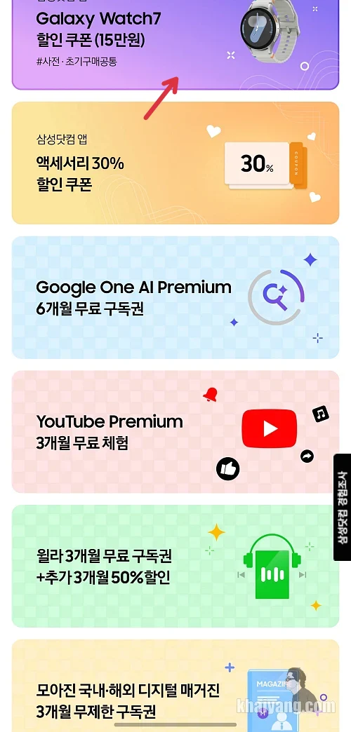 구매 혜택 페이지가 나오는데 여기에서 상단에 있는 갤럭시워치7 할인 쿠폰 배너를 선택해 줍니다.