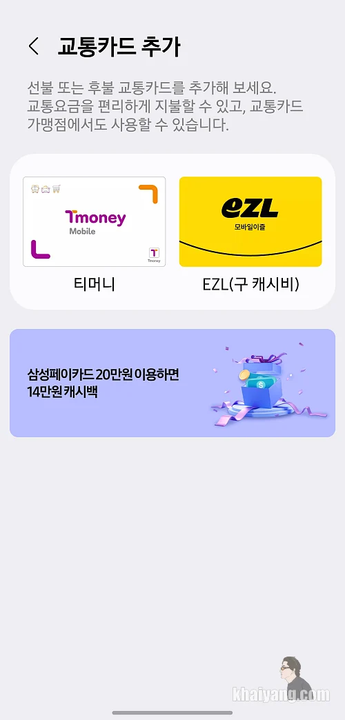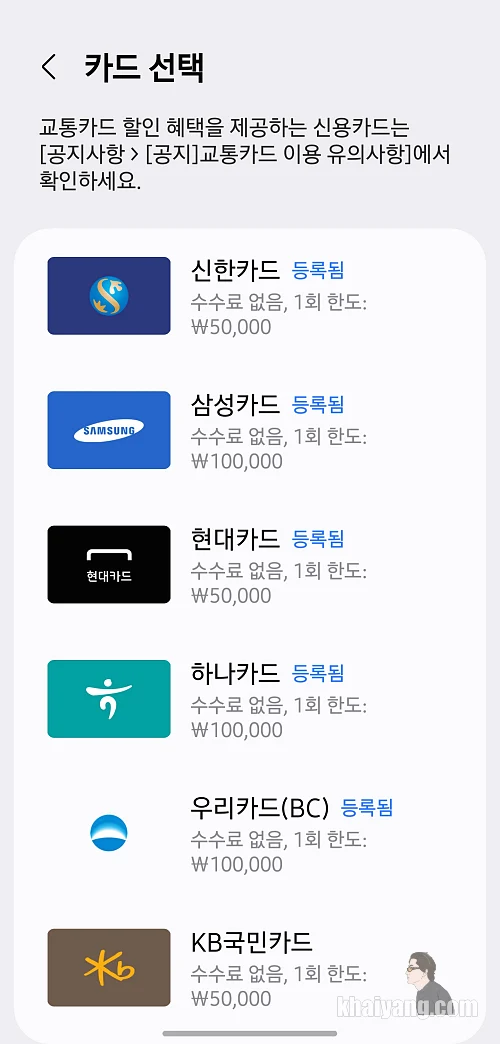 카드를 선택 하셔야 하는데, 삼성월렛에 등록해 놓은 카드 중에 교통카드를 지원하는 카드들이 화면에 나옵니다.