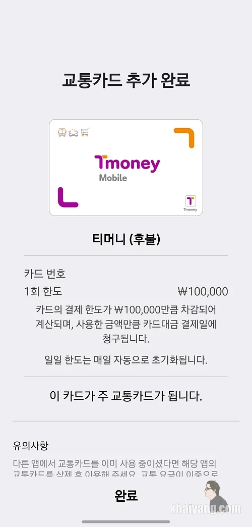 교통카드 추가 완료 화면이 표시 되면 이제 앞으로 편하게 스마트폰으로 대중교통을 이용할 수 있습니다.