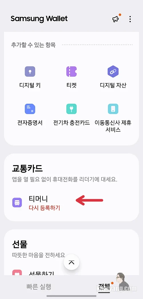 이번 시간에는 삼성월렛에 들어 있는 티머니 교통 카드 등록에 대해서 살펴 보겠습니다.