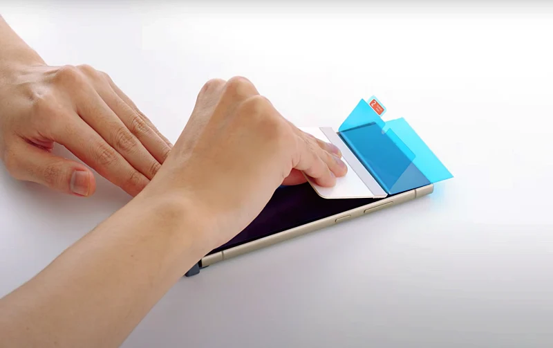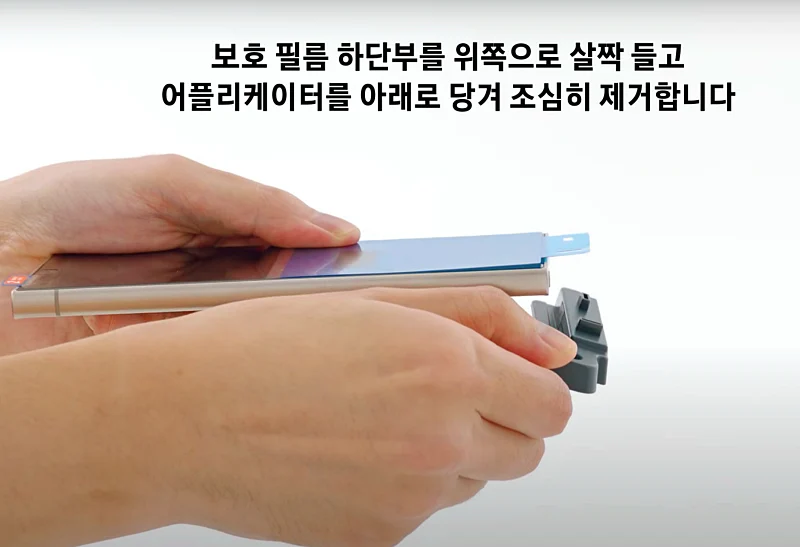 먼지 없음을 확인후에 한손으로 필름을 들고 다른 한 손으로 스퀴지로 천천히 밀어 줍니다.