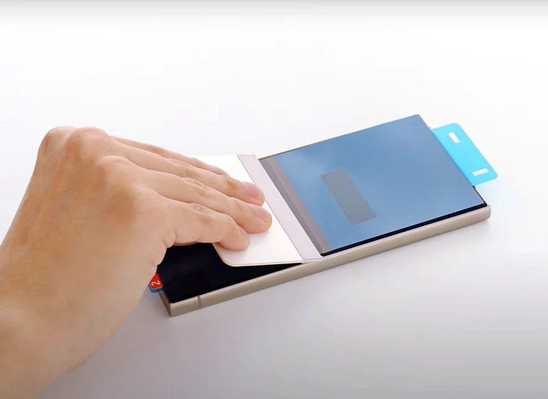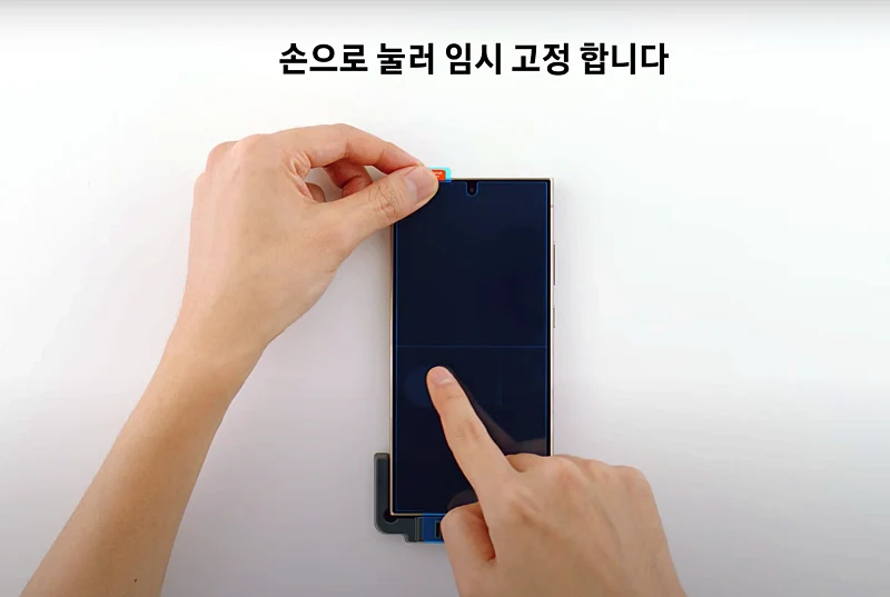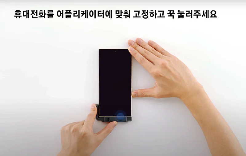 갤S25 울트라를 어플리케이터에 딱 맞게 고정 시켜서 부착되게 눌러 주세요. 여기서 고정이 잘 되야 필름 붙일때 제대로 부착할 수 있습니다.